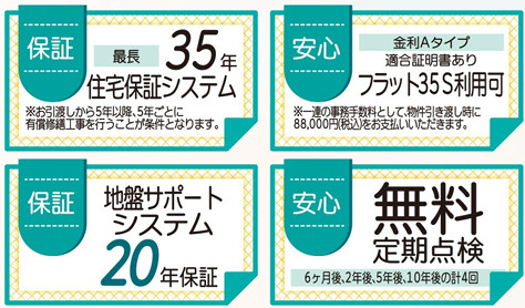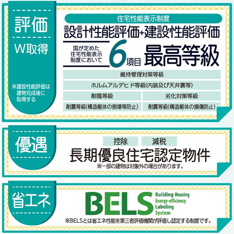 <設計性能評価+建設性能評価(国が定めた住宅性能表示制度)> ☆【6項目最高等級】 ・維持管理対策等級 ・ホルムアルデヒド等級(内装及び天井裏等) ・耐風等級 ・劣化対策等級 ・耐震等級(構造躯体の倒壊等防止) ・耐震等級(構造躯体の損傷防止) ☆【長期優良住宅認定物件】 ・控除、減税 ☆【BELS】※省エネ性能を第三者評価機関が評価し認定を受けております。 ☆地盤サポートシステム ・20年保証 ☆無料定期点検 ・6か月、2年後、5年後、10年後の計4回 |